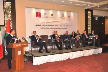 نظم اتحاد رجال الأعمال الفلسطينيين هذا اليوم الأحد في فندق الكرمل بمدينة رام الله المنتدى الثالث لمجلس الأعمال الإيطالي الفلسطيني بالشراكة مع بنك فلسطين وبحصور وفد مؤلف من ما يزيد عن 50 رجل أعمال إيطالي يزورون فلسطين بهدف لقاء عدد من رجال أعمال فلسطينيين لتعزيز التعاون المشترك وتطوير التجارة وزيادة حجم التبادل التجاري بين البلدين.