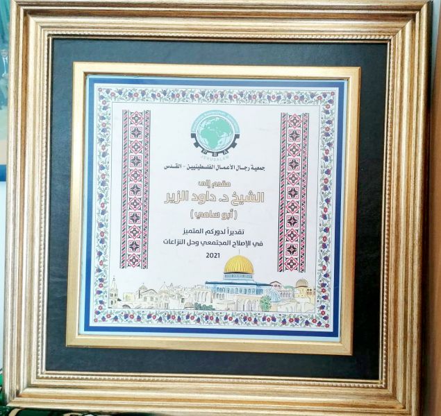 وفي نهاية الحفل قدمت الجمعية شهادات شكر وتقدير ودرع تكريم لرئيس اللجنة واعضائها. وكان الرئيس محمود عباس قد شكّل مؤخرا لجنة برئاسة الشيخ داود الزير، لحل ومعالجة الأحداث التي شهدتها مدينة الخليل في الأيام الأخيرة وأوعز الرئيس للجنة بالعمل على وجه السرعة لمعالجة الأحداث بما يحفظ السلم الأهلي والمجتمعي في المدينة.