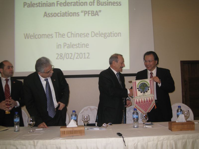 إستقبل إتحاد جمعيات رجال الأعمال الفلسطينيين وفدا من رجال الأعمال الصينيين والأكاديميين في فندق موفنبيك برام الله يرافقهم السفير الفلسطيني في بكين أحمد رمضان وبرئاسة لو كانغ البروفسور في الدراسات الإستراتيجية، وكان في الإستقبال رئيس الإتحاد محمد مسروجي وحسن أبو شلبك وناصر العسيلي وبسام جبر من مجالس إدارة جمعيات الإتحاد وماجد معالي أمين عام الإتحاد وأمجد النمر مدير ملتقى رجال الأعمال في نابلس وجهاد عقل منسق العلاقات العامة ومجموعة من رجال الأعمال الفلسطينيين من القطاعات الرديفة لتشكيلة الوفد الزائر الذين التقوا بنظرائهم الصينيين وأطلعوهم على الظروف الإقتصادية والإستثمارية في فلسطين آملين في التعاون ونقل الخبرات والتكنولوجيا والدخول في شراكات تجارية وإستثمارية واعدة في فلسطين .